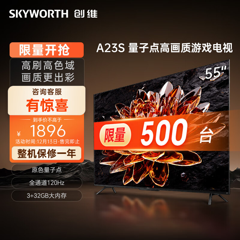 创维电视55A23S 55英寸电视机量子点120Hz高刷3+32G蓝牙5.0双频WIFI 4K超高清声控屏游戏电视价格:1896.00元!
