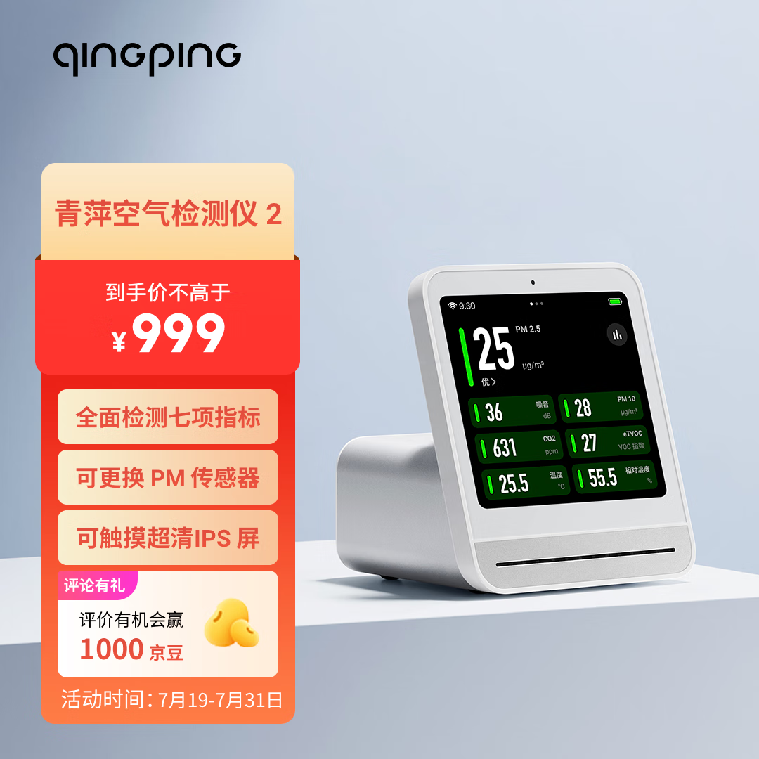 青萍空气检测仪 2 家用监测室内空气质量雾霾表温湿度噪音 CO2 TVOC PM2.5 PM10检测仪器 白色价格:999.00元!