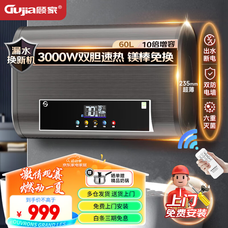 顾家(Gujia)电热水器60L储水式家用扁桶超薄双胆3000W速热一级能效出水断电定时热水器DSZF-B10-60价格:1299.00元!