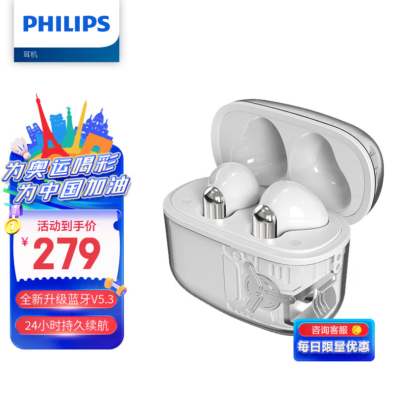 飞利浦(PHILIPS)真无线蓝牙5.3手机通话降噪运动跑步重低音音乐耳TAT1168白色价格:279.00元!