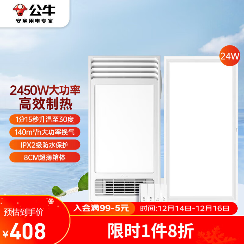 公牛(BULL)浴霸风暖浴室卫生间LED灯集成吊顶GY25AJZ浴霸+24W白色平板灯价格:510.00元!
