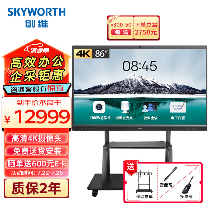 创维(Skyworth)会议平板一体机86英寸智能触摸电子白板无线同屏视频会议8阵列麦克风86MBK7投屏器推车商用显示价格:12999.00元!