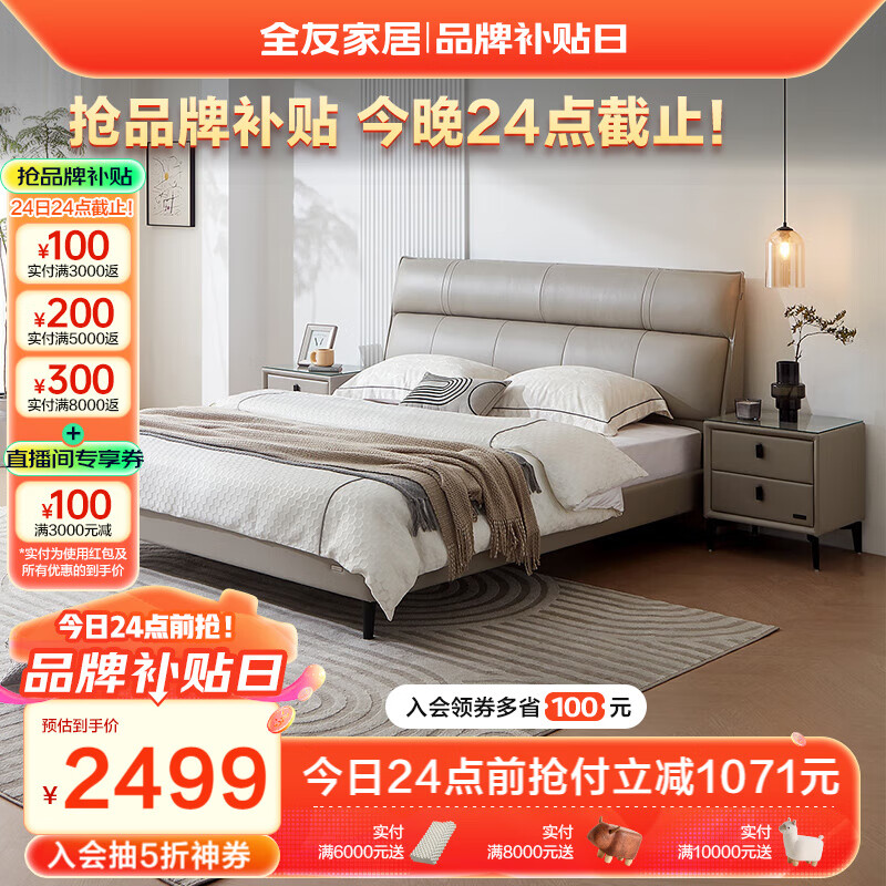 全友家居 头层牛皮床真皮床现代简约卧室高脚双人床1.5米x2米116033价格:3570.00元!