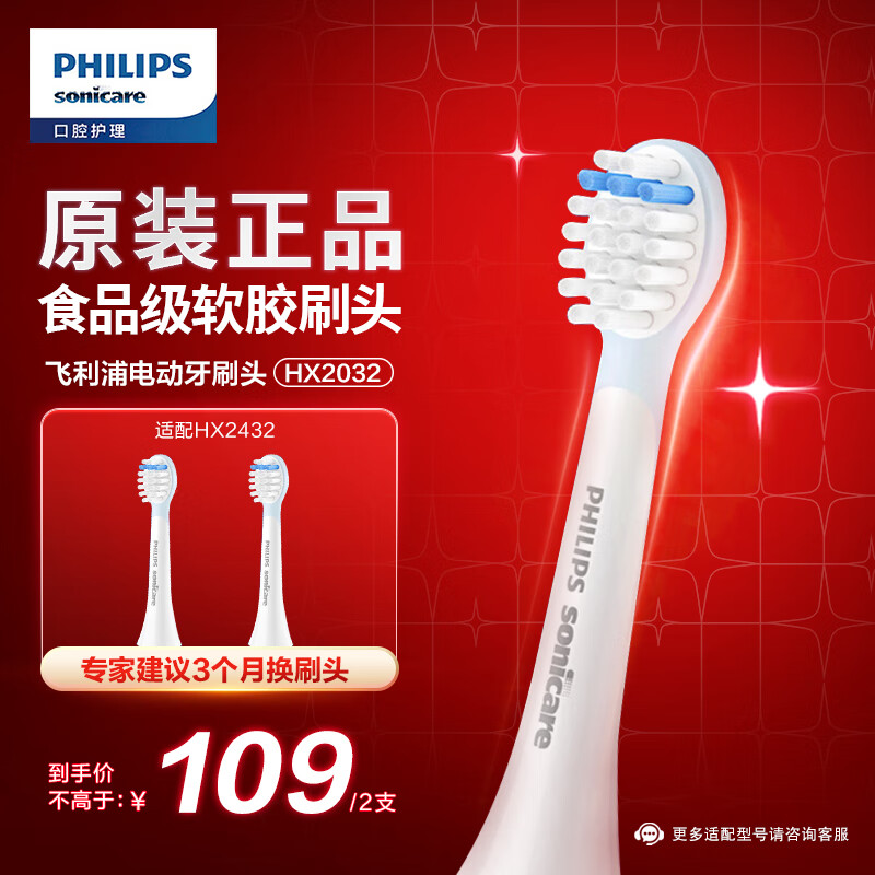 飞利浦电动牙刷头 儿童迷你型 硅胶材质不伤牙 2支装 HX2032/02 适配HX2432/02 HX2432/01价格:109.00元!