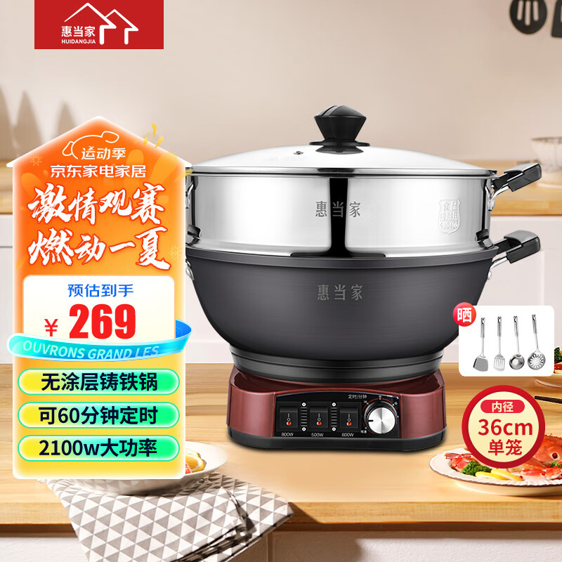 惠当家(Hui Dang Jia)电炒锅多功能电热锅电锅定时电蒸锅一体加厚铸铁锅电煮锅多用途锅HDJDT2-36价格:269.00元!