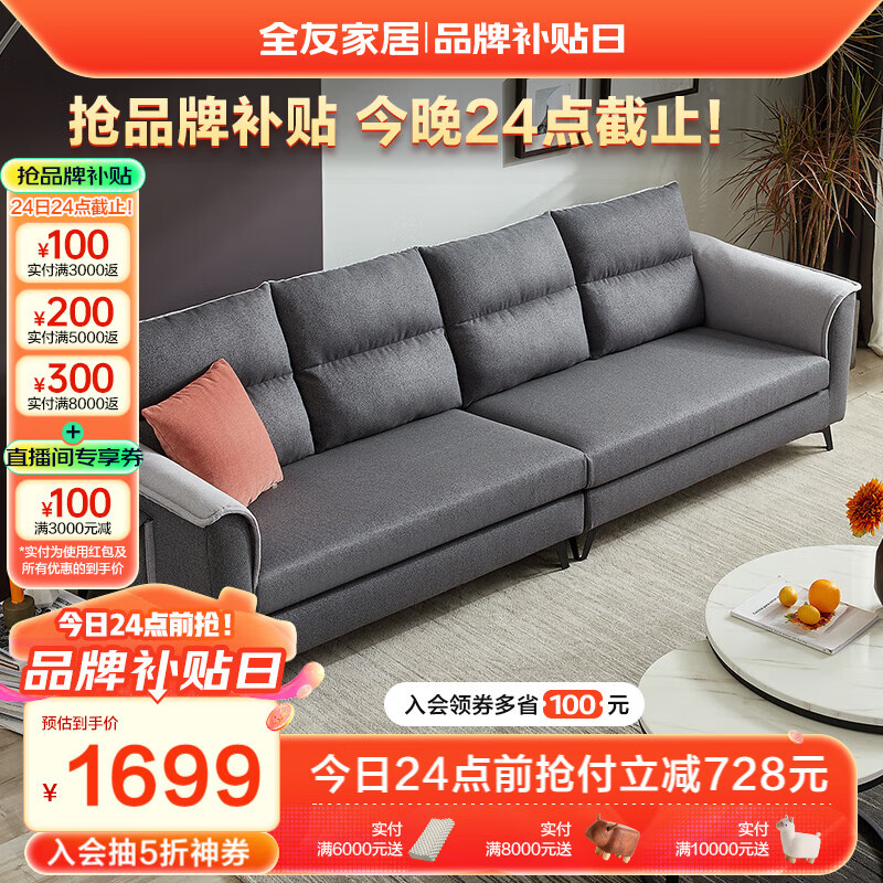 全友家居 简约四人位沙发直排布艺沙发客厅小户型北欧休闲沙发102567价格:2427.14元!