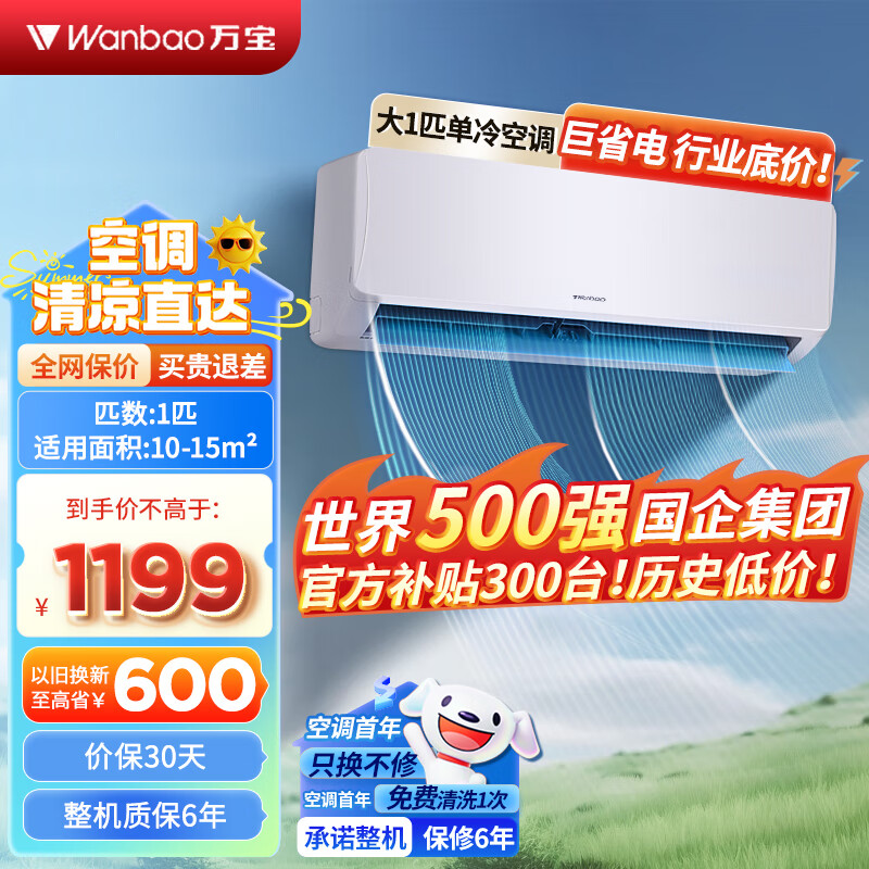 万宝空调挂机1匹快速制冷 新能效卧室家用定频壁挂式空调出租屋节能轻音KF-25GW/WB9-N5 含基础安装价格:1199.00元!