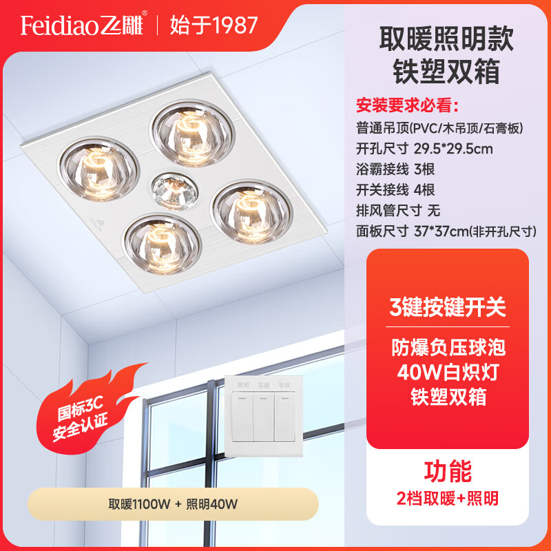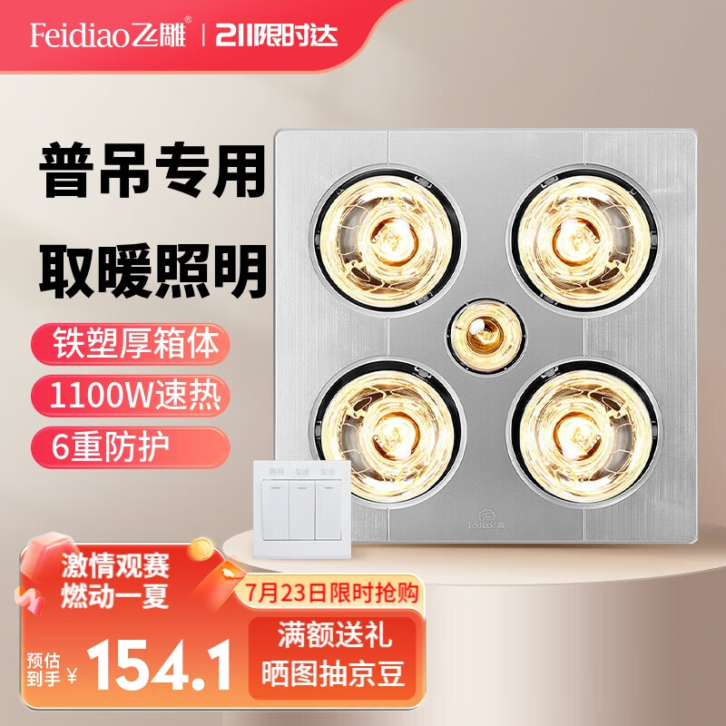飞雕(FEIDIAO)灯暖浴霸取暖照明浴室取暖器灯暖一体卫生间适用普通吊顶传统吊顶价格:154.11元!