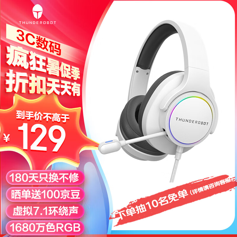 雷神(ThundeRobot)H51有线耳机 白色游戏耳机 USB电脑耳麦 电竞头戴式耳机 虚拟7.1立体环绕声价格:129.00元!