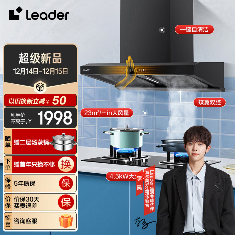 海尔(Haier)智家 统帅 抽油烟机 欧式顶吸双腔烟灶套装 大吸力23m3/min 排油烟机燃气灶具 家用IKS9Z+GL2D天价格:1998.00元!