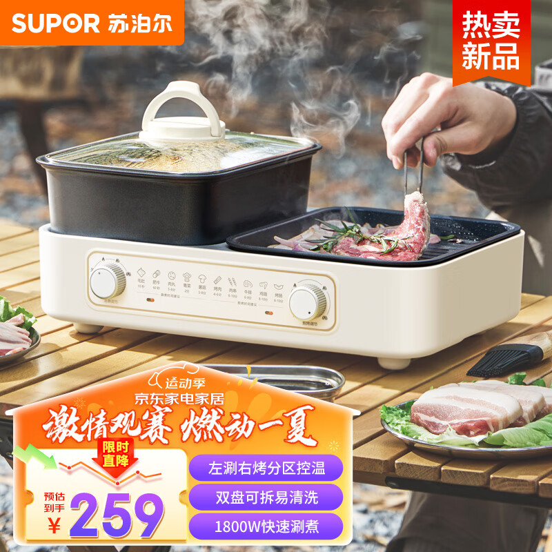 苏泊尔电烤盘 烤串 煎肉 多功能烤肉锅 烤涮一体锅 大号烧烤炉电火锅 1800W大火力 家用电烤盘GJ3824S808价格:259.00元!