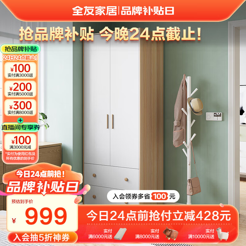 全友家居 衣柜现代北欧风二门衣柜卧室储物家具平开门衣柜126331价格:1427.14元!