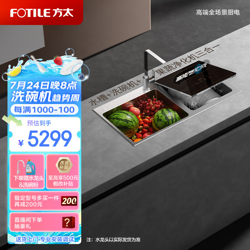 方太水槽洗碗机家用 高能气泡洗 升级41升大容量水槽 跨界三合一 加强除菌 洗海鲜果蔬去农残CT03B价格:5799.00元!