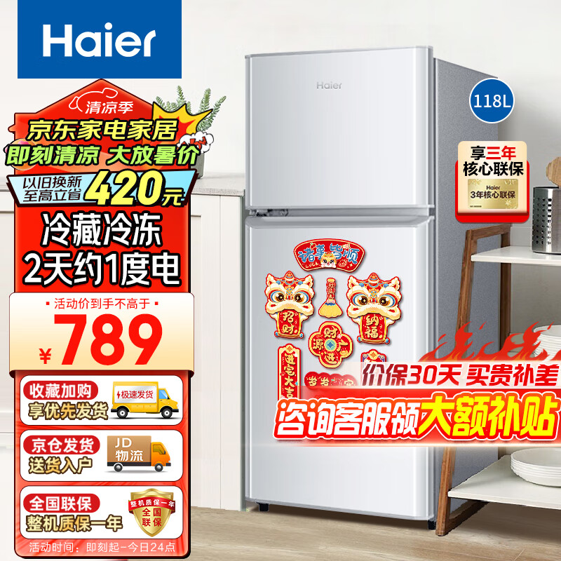 海尔(Haier)118升小型两门迷你小冰箱 节能省电冷藏冷冻双门家用宿舍租房冰箱办公室节能环保电冰箱价格:789.00元!