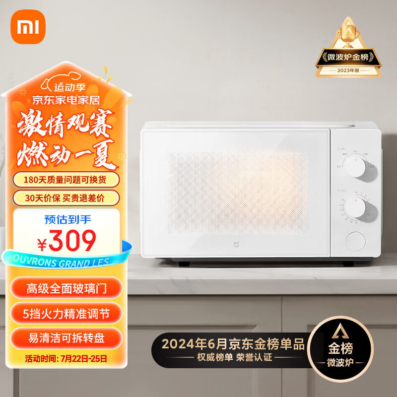 米家小米微波炉家用小型多功能 小尺寸可拆转盘式 大火力均匀加热 机械式双旋钮易操作 台式大容量20升价格:309.00元!