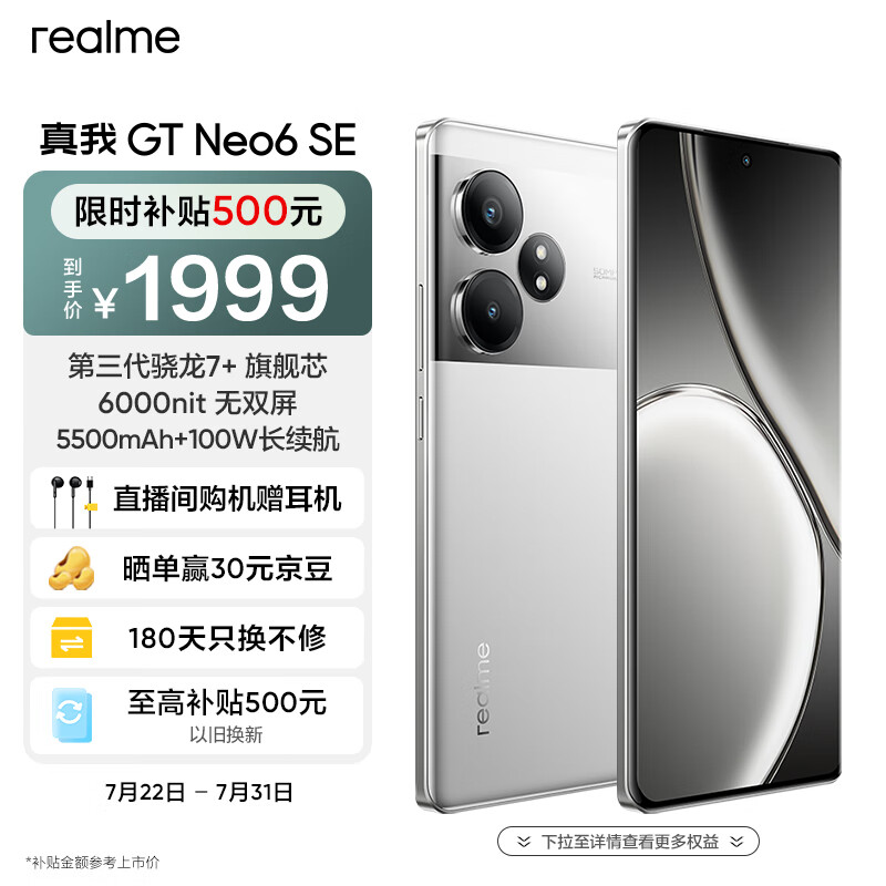 realme真我GT Neo6 SE第三代骁龙7+旗舰芯 6000nit无双屏 5500mAh超长续航 AI 5G游戏手机16+512流银骑士价格:2099.00元!