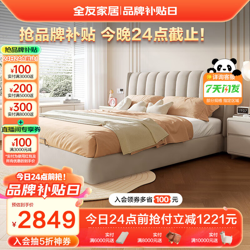 全友家居 床现代简约双人床1.8米卧室家具科技布软靠大床105207C价格:4070.00元!