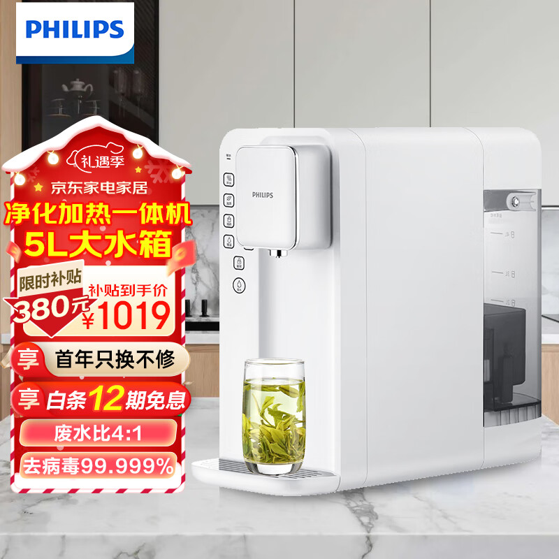 飞利浦(PHILIPS)净水器家用 净水器加热直饮一体机 台上式免安装即热直饮水机 RO反渗透净水器 双芯大水箱 家庭款5L大水箱ADD6812价格:1019.00元!