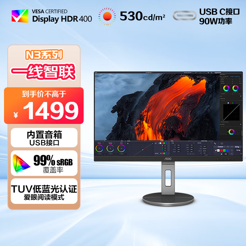 AOC 23.8英寸 2K 75Hz IPS HDR400 Type-C接口90W TUV爱眼认证 旋转升降 内置音箱 电脑显示器 Q24N3R价格:1499.00元!