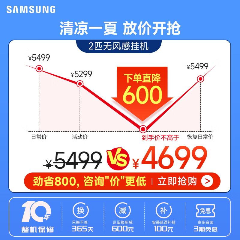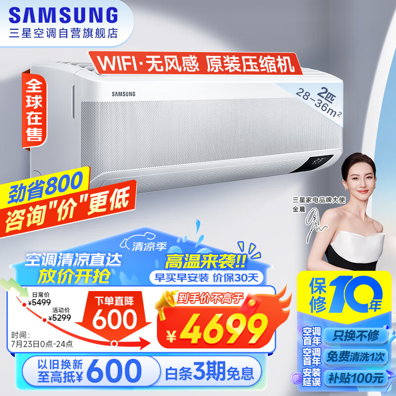 三星空调2匹无风感全直流变频WIFI新三级能效冷暖壁挂式客厅挂机28-36㎡适用以旧换新AR18TSFAAWKNSC价格:4699.00元!