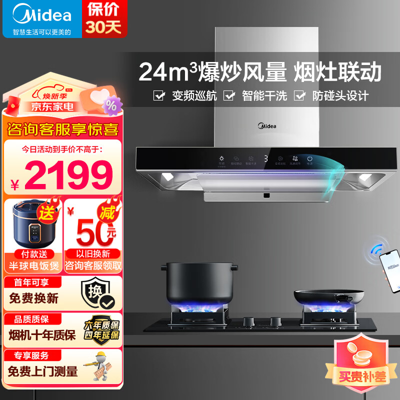 美的(Midea)家用抽油烟机24立方大吸力欧式顶吸变频巡航排烟机智能干洗挥手控制厨房电器以旧换新TP80价格:2199.00元!