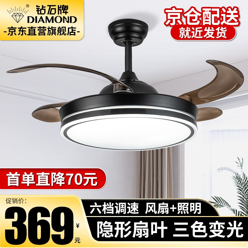 钻石牌(DIAMOND) 吊扇灯 隐形风扇灯led餐厅客厅卧室吊灯饰 现代简约电扇灯吸顶带灯吊扇 48吋黑色双圆-6档遥控-正反转功能价格:399.00元!