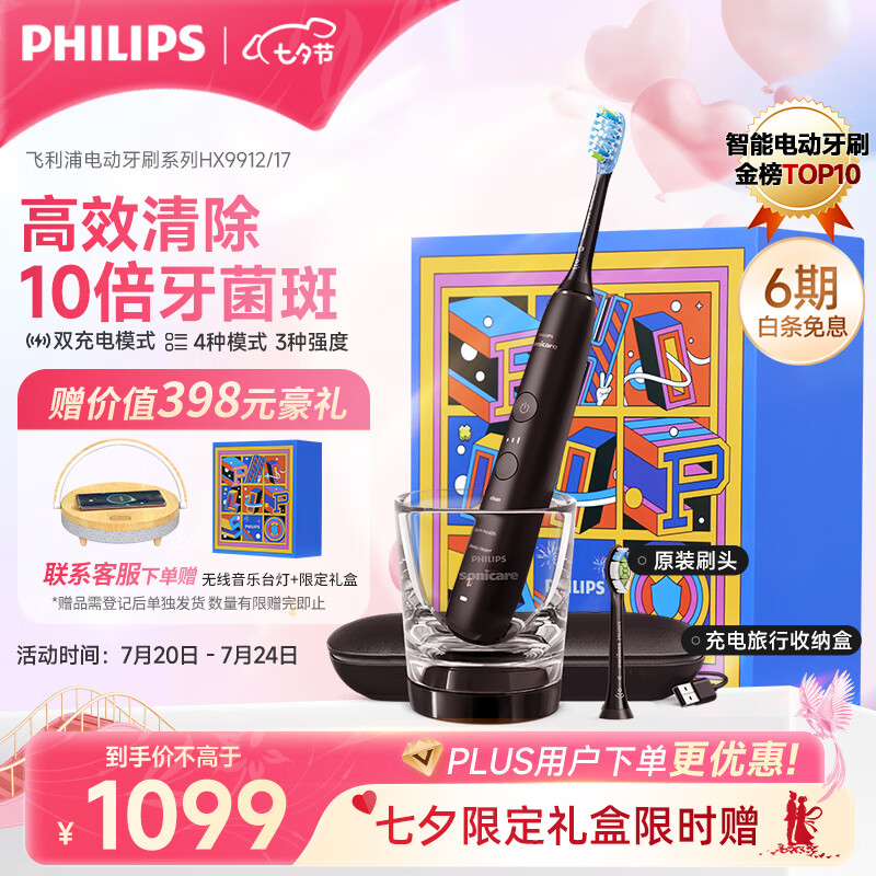 飞利浦(PHILIPS)声波震动电动牙刷 七夕情人节礼物 送男友/女友 蓝牙APP含刷头+充电玻璃杯 钻石刷9系Pro HX9912价格:1099.00元!