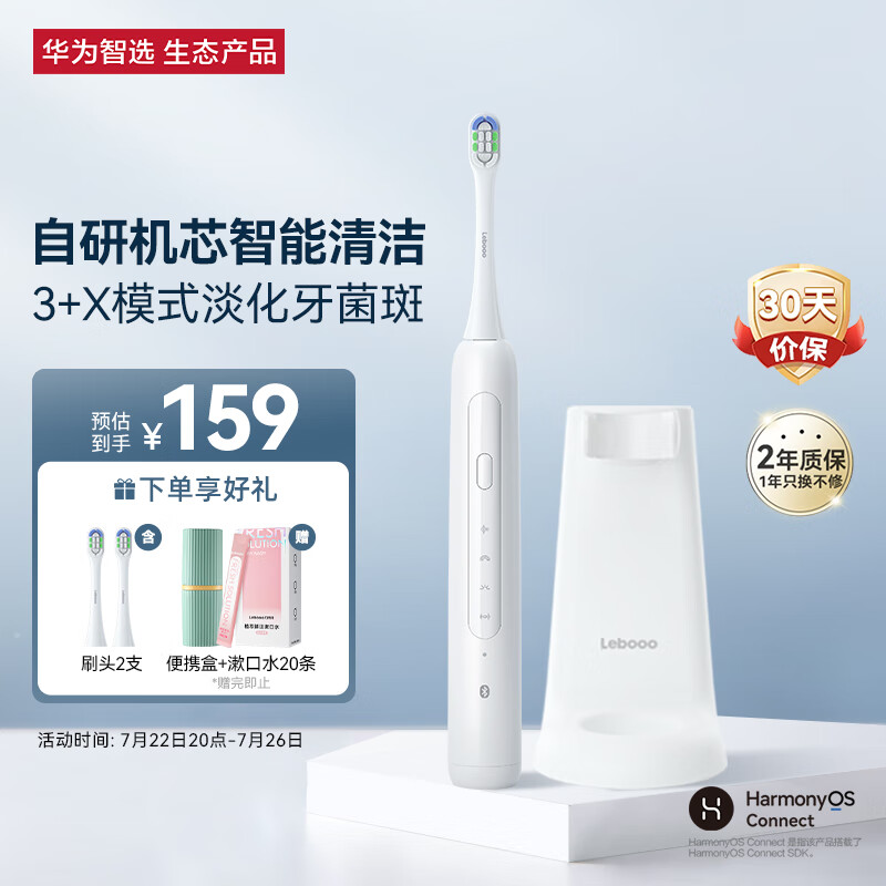 华为智选力博得电动牙刷 智能声波牙刷 长续航 情侣款 光感白 送女友牙刷七夕情人节礼物(支持鸿蒙智联)价格:159.00元!
