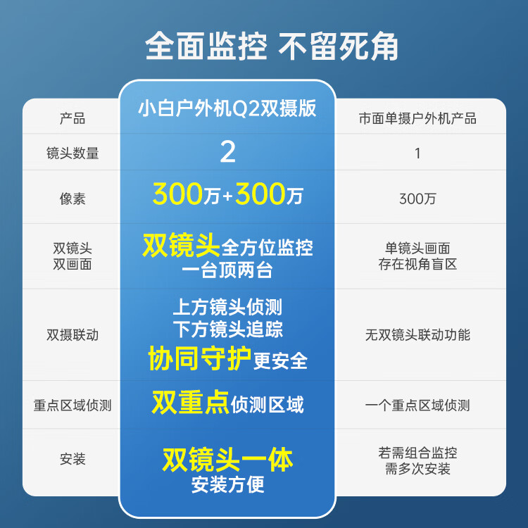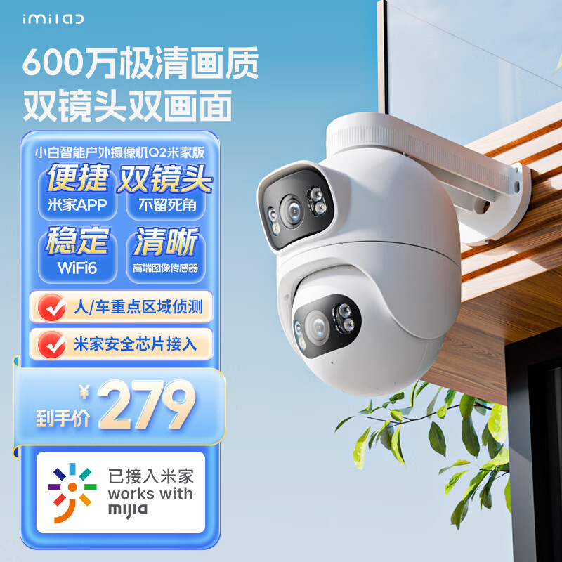 小白Q2双摄版已接入米家摄像头室外防水监控器360度带夜视600W像素wifi6网络手机远程AI人车侦测价格:289.00元!