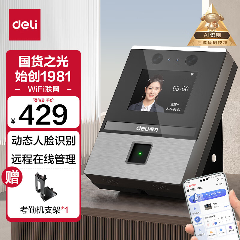 得力智能云考勤机 人脸+指纹打卡 可见光动态人脸识别 活体检测 wifil联网 远程在线管理DL-D3价格:429.00元!