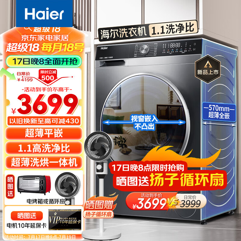 海尔(Haier)滚筒洗衣机全自动直驱洗烘一体机超薄全嵌10公斤大容量洗衣机智能投放1.1洗净比双涡旋自清洁价格:4199.00元!