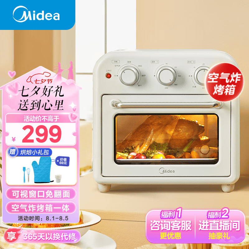美的(Midea)家用多功能空气炸锅电烤箱一体机 高效脱脂/可视化/循环热风免翻面 15L浅杏色PT1510价格:299.00元!
