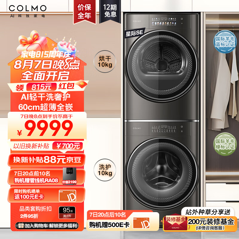 COLMO【黑珍珠系列】洗烘套装10KG洗烘套装全自动洗衣机热泵烘干机 婴儿洗超薄全嵌CLGN10HEL+CLHZ10HDL价格:10998.00元!