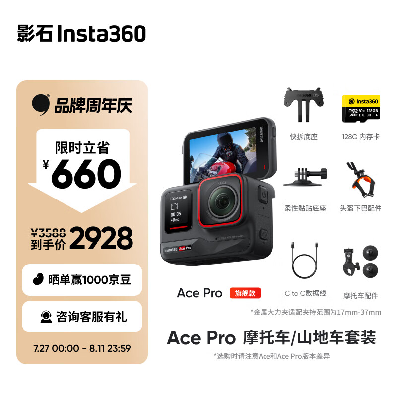 Insta360影石 Ace Pro运动相机AI智能摄像机防抖摩托(摩托车/山地车套装)价格:2928.00元!