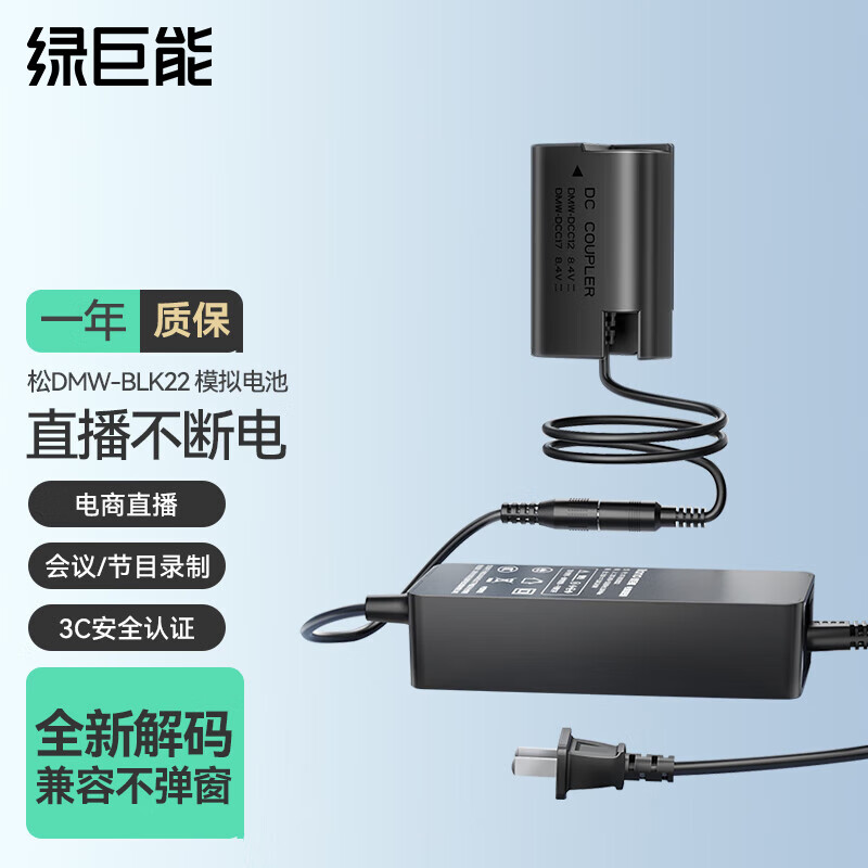 绿巨能(llano)松下DMW-BLK22假电池DC-S5模拟电池外接电源适配器GH5M2 GH6微单vlog视频直播供电电池价格:149.00元!