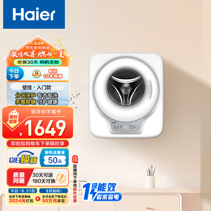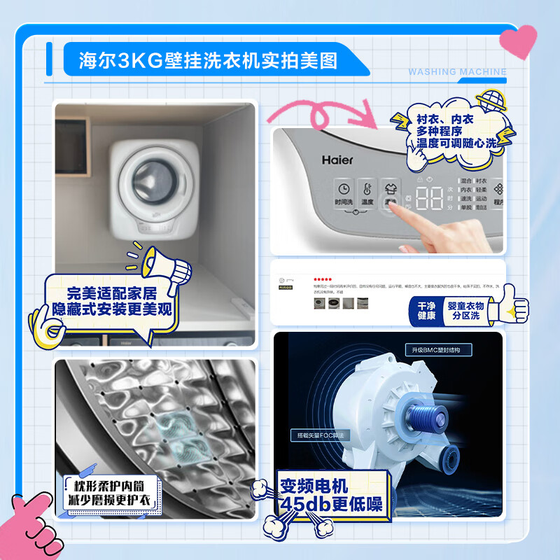 海尔(Haier)壁挂洗衣机 洗衣机全自动小型 内衣裤洗衣机 婴儿儿童挂壁式 3KG 除菌 一级能效 以旧换新EGM30707价格:1599.00元!