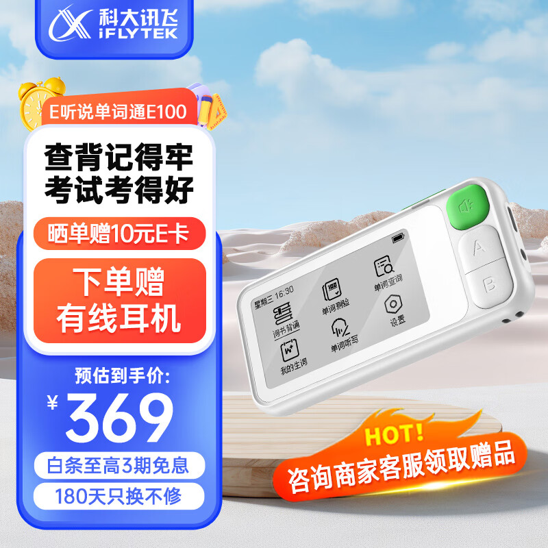 科大讯飞E听说单词通E100 电子单词卡 英语学习学霸记忆卡学习卡 单词通 2.66英寸墨水屏价格:369.00元!