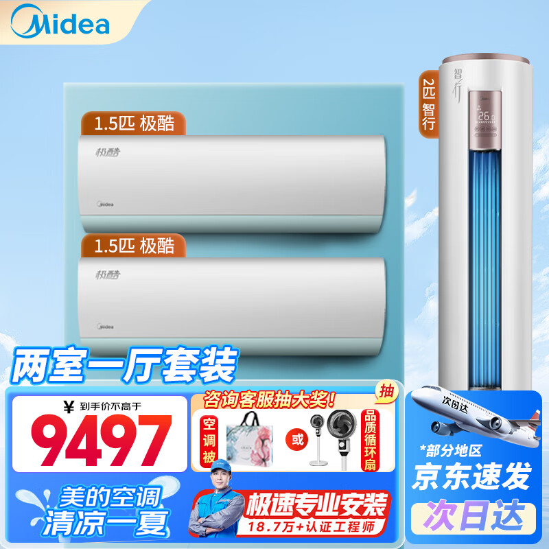 美的(Midea)空调套装两室一厅套餐 2匹智行+冷静星/酷省电/风酷/极酷 新一级能效变频挂机柜机价格:9497.00元!