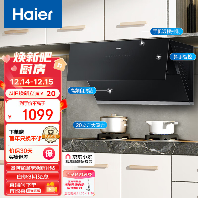 海尔(Haier)抽油烟机 侧吸式吸油烟机 20m3/min大吸力420pa挥手智控高频自旋洗京东小家C10SU1价格:1099.00元!