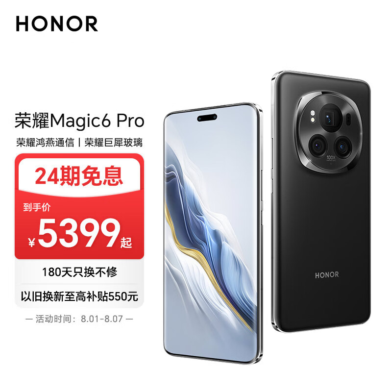 荣耀Magic6 Pro 荣耀鸿燕通信 单反级荣耀鹰眼相机 第三代骁龙8芯片 12GB+256GB 绒黑色 5G AI手机价格:5399.00元!