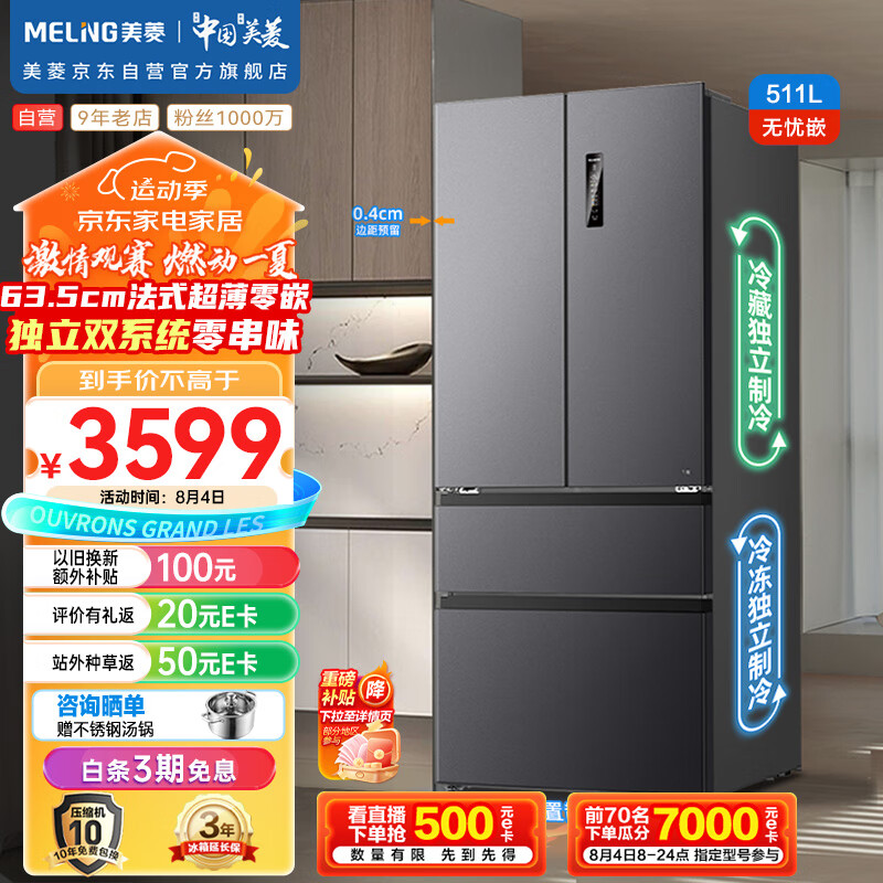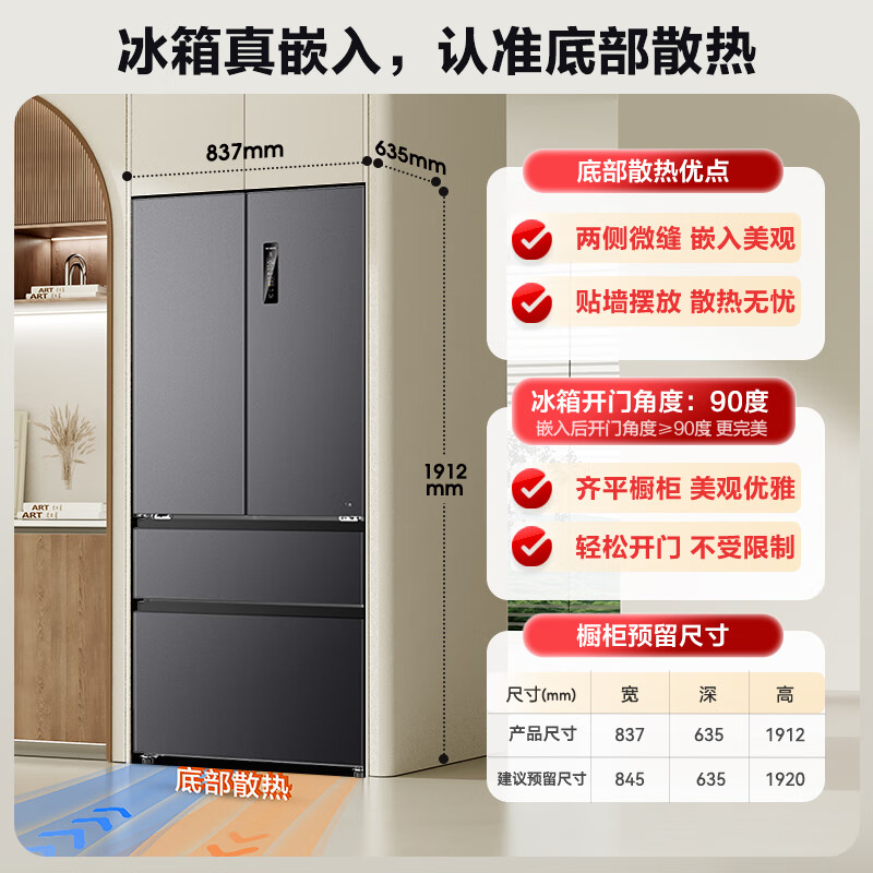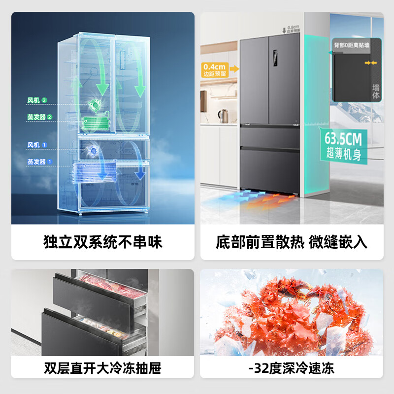 美菱(MeiLing)511升法式多门四开门超薄零嵌入式冰箱家用双系统双循环大容量无霜变频一级能效BCD-511WP9CZX灰价格:3899.00元!