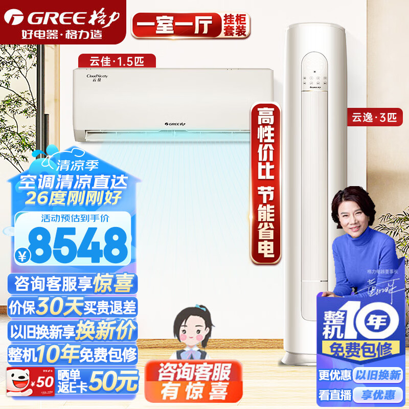 格力(GREE)空调 快速冷暖除湿新能效智能空调组合套装(1.5匹云佳三级挂机+3匹云逸三级柜机)价格:8548.00元!