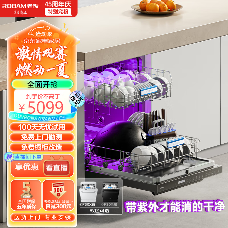 老板(Robam)F30X-黑13套嵌入式去重油污洗碗机家用热风烘干消杀168h长效存储紫外加强除菌一体机独立式分层洗价格:5099.00元!