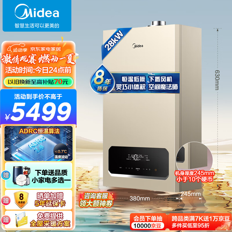 美的(Midea)双变频一级低噪舒适恒温燃气壁挂炉 天然气供暖 地暖 家用锅炉省气 以旧换新 下置风机L1GB28-R05价格:6699.00元!