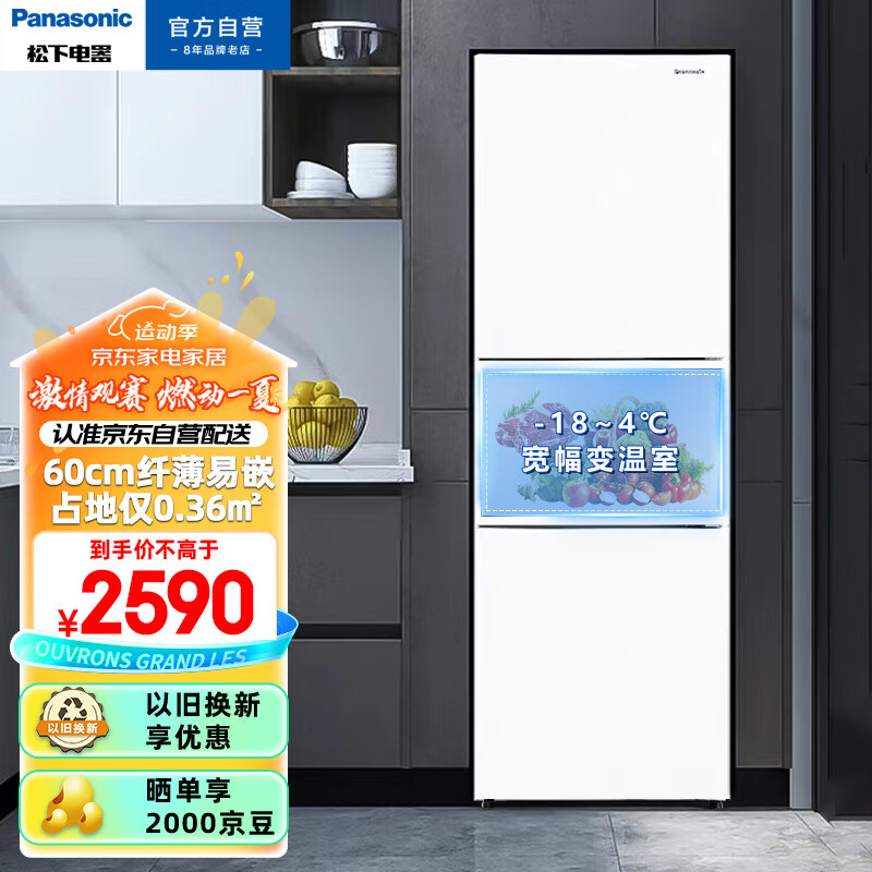 松下(Panasonic)磨砂白色270升家用三门冰箱 60cm超薄小 自由嵌入式 风冷无霜NR-EC27WPB-W价格:2590.00元!