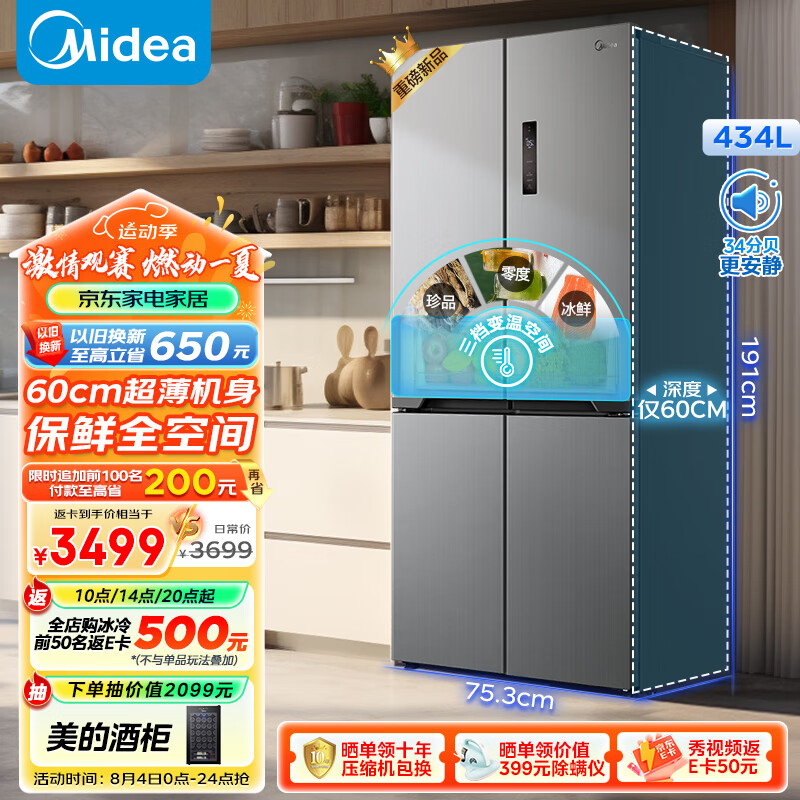 美的(Midea)M60系列60cm薄455流苏银十字双开门四开门一级变频风冷无霜智能家用大容量电冰箱MR-455WSPZE价格:3999.00元!