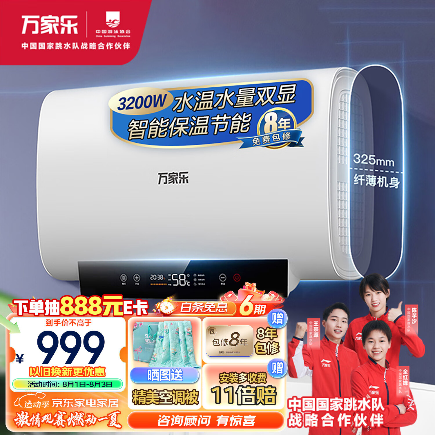 万家乐电热水器扁桶60升储水式双胆3200W速热 预约洗澡 水量水温双显 智能记忆D60-DB1价格:999.00元!