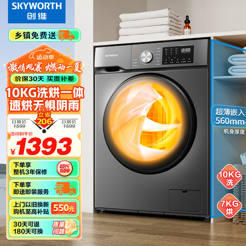 创维10公斤大容量滚筒洗衣机全自动 洗烘一体机 超薄嵌入 空气洗 除菌除螨 XQG100-B26RBH(E)价格:1399.00元!