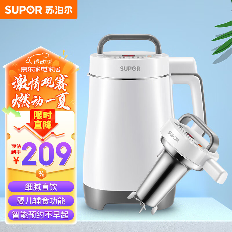 苏泊尔(SUPOR)豆浆机1.2L家用多功能 破壁免滤2-3人食多功能可预约搅拌榨汁料理机DJ12B-P17E价格:209.00元!