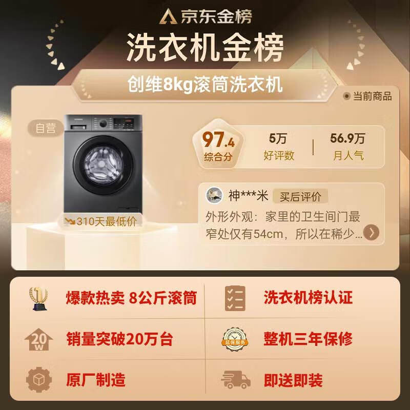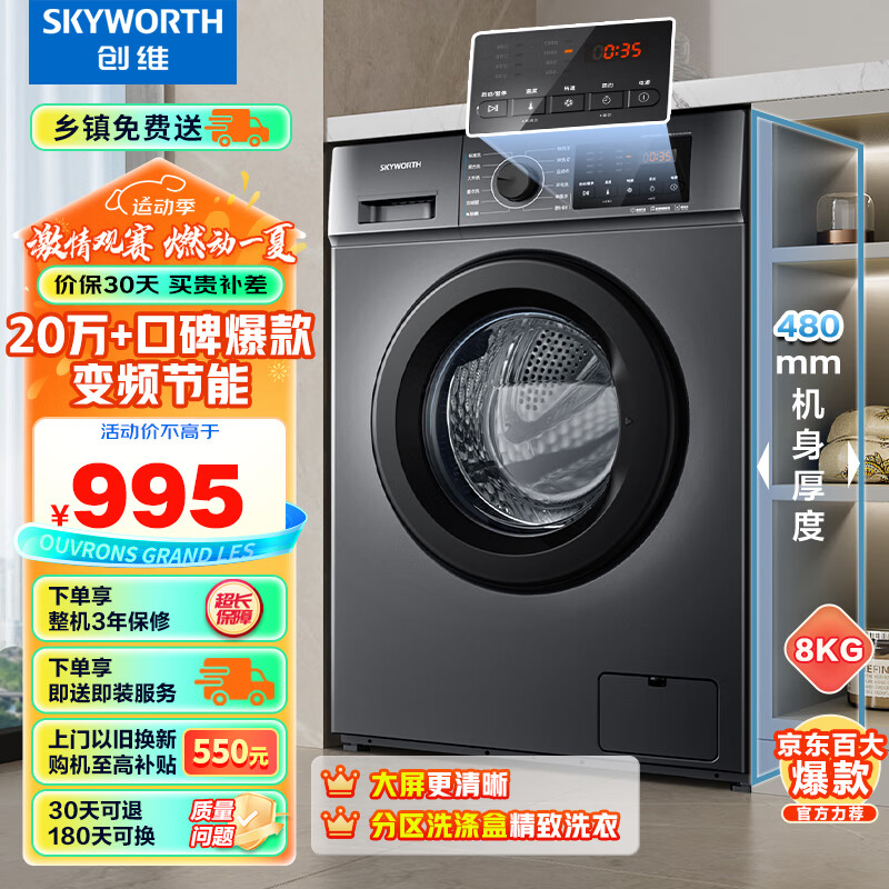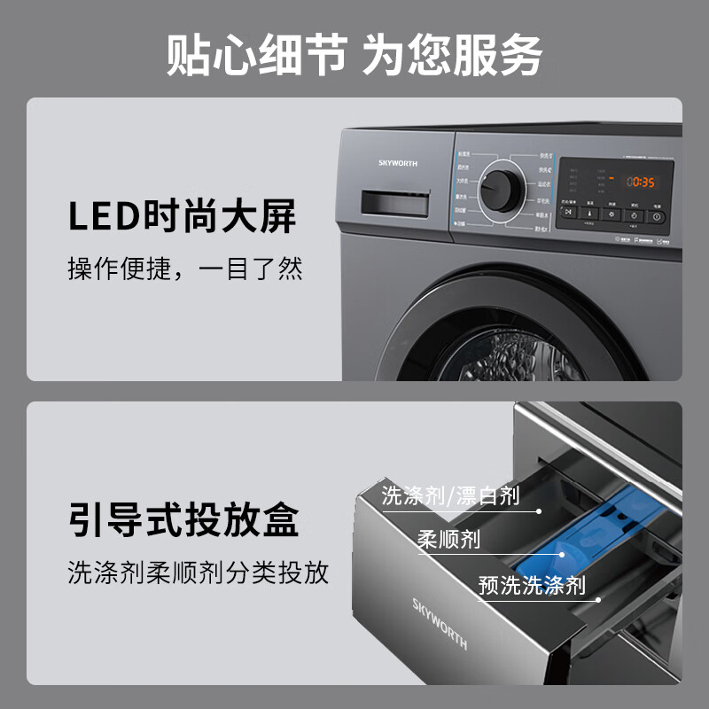 创维(SKYWORTH) 8公斤滚筒洗衣机全自动 变频电机 一级能效 除尘除螨 超薄嵌入 XQG80-B15MC价格:999.00元!